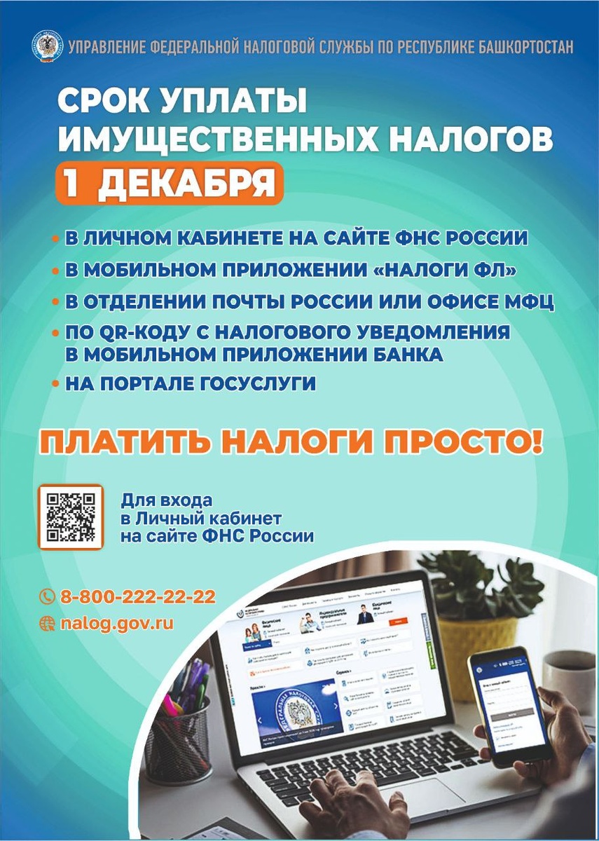 Успейте оплатить имущественные налоги не позднее 1 декабря 2025 года! 🗓 1 декабря 2025 года истекает срок уплаты имущественных налогов физических лиц. Оплатить можно через: 🥦 личный кабинет налогоплательщика на сайте «ФНС России» 🥦 мобильное приложение «Налоги ФЛ» 🥦 отделение «Почта России» или офиса МФЦ 🥦 QR-код с налогового уведомления в мобильном приложении банка 🥦 на портале «Госуслуг» #МФЦБашкортостана