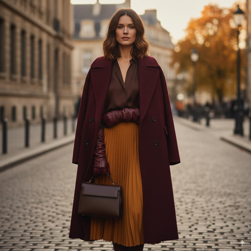 Винный (Burgundy / Cherry Red): Глубокий, насыщенный, как бокал хорошего мерло. Это может быть пальто, кожаная юбка, кашемировый свитер или даже тотальный образ в этом цвете. Он выглядит дорого, благородно и идет практически всем. Он не такой строгий, как черный, но такой же элегантный.