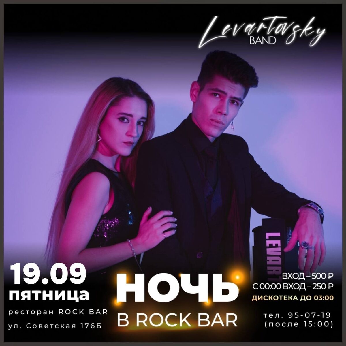 19 СЕНТЯБРЯ ПТ. "НОЧЬ В ROCK BAR” 21:30-03:00 ГРУППА LEVARTOVSKY BAND & ДИСКОТЕКА Красивый вечер пятницы с стильной командой LEVARTOVSKY BAND, любимыми песнями и танцами! В продолжении концерта - наша дискотека из хитов всех стилей и времён! Вход 500₽, с 00:00 - 250₽ ✅ Уважаемые гости! Пожалуйста, если Вы опаздываете, позвоните или напишите нам, при опоздании более 15 минут без предупреждения бронь может сниматься. АС 18+ FC/DC Данная публикация носит исключительно информационный характер. 📞INFO/RV (с 15:00) +7-9148-95-07-19 💻 INFO/RV: www.rockbar38.ru 📍г.Иркутск, ул. Советская 176Б