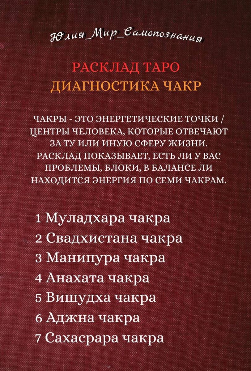 🔥 ДИАГНОСТИКА ЧАКР Друзья, в период коридора затмений у кого-то судьбоносно происходят события, кто-то принимает важные для себя решения.. но для всех это однозначно значимый период. 💗 Вы можете узнать, в каком состоянии находятся сейчас Ваши чакры (энергетические центры - точки в Вашем теле). Таро расклад «Диагностика чакр» показывает, есть ли у Вас проблемы или блоки, в балансе ли находится энергия. 🏵️ 7 чакр: 🔴 Муладхара - выживание, потребности, чувство безопасности. 🟠 Свадхистана - творчество, семья, дети, радость к жизни, сексуальная энергия. 🟡 Манипура - ответственность, сила воли, эго. 🟢 Анахата - сердечная чакра, любовь, принятие себя. 🔵 Вишудха - общение, навыки коммуникации, голос, речь. 🔵 Аджна - интуиция, видение, мышление, третий глаз. 🟣 Сахасрара - связь со Вселенной, высшими силами, духовный уровень. 💗 Расклад показывает Ваше внутренне состояние и взаимодействие с внешним миром на данный момент времени. Если энергия в дисбалансе, я даю рекомендацию, что
