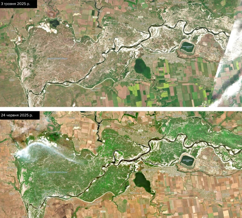 Пустыня на месте бывшего дна водохранилища не образовалась. Докладываю. Много было разговоров, что после взрыва в 2023 году плотины Каховской ГЭС и ухода воды из водохранилища, на его месте образуется пустыня с мертвой потрескавшейся поверхностью из загрязненных донных отложений. Природа распорядилась по своему. Прошло всего два года, и на бывшем дне образовалась новая пойменная экосистема из зарослей камыша и ивовых лесов, высотой более человеческого роста. Вот, посмотрите, в сети есть спутниковые снимки водохранилища за начало мая и конец июня этого года. Мы видим, что за полтора месяца бывшее дно водоема окрасилось в буйные зеленые цвета почувствовавших весну растений: На территории дна водохранилища образовались небольшие озера с колониями птиц по их берегам. Реки, протекавшие по пойме до строительства плотины, вернулись в свои русла. Ученые говорят, что в пойму Днепра очень быстро вернулось и множество растений, которые росли здесь до 1956 года. Погибло очень много рыбы, котора