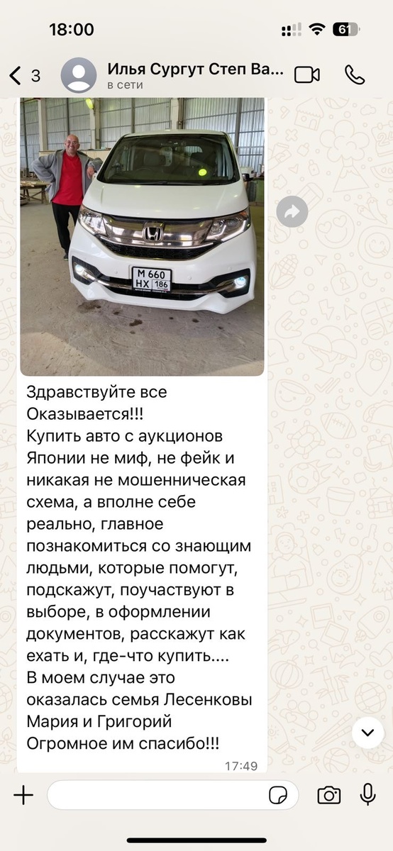 Не так давно мы купили Honda StepWgn, 2016 года, с пробегом 64 000 км и оценкой 4 балла. Статья об этом автомобиле https://dzen.ru/a/aIGyAaqR3GwyAZbs здесь. Клиент ездил сам за авто, в компанию с собой взял сына, машина уже поставлена на учет и ездит по просторам г. Сургут. По приезду клиент оставил нам отзыв. А вот машинка уже с номерами 😉