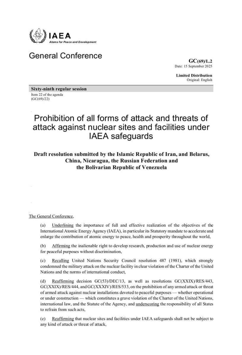 Иран совместно с Россией, Белоруссией, Китаем, Венесуэлой и Никарагуа представил на 69-й сессии Генеральной конференции МАГАТЭ проект резолюции о запрете нападений на ядерные объекты, сообщил представитель иранского МИД Эсмаил Багаи. "Как подтверждается в нашем проекте, все страны пользуются "неотъемлемым правом развивать ядерную энергетику в мирных целях" и "имеют право на эффективные гарантии против любого нападения или угрозы нападения"... Эти принципы необходимо соблюдать; международному сообществу давно пора принять решительные меры, чтобы не допустить нормализации беззакония".