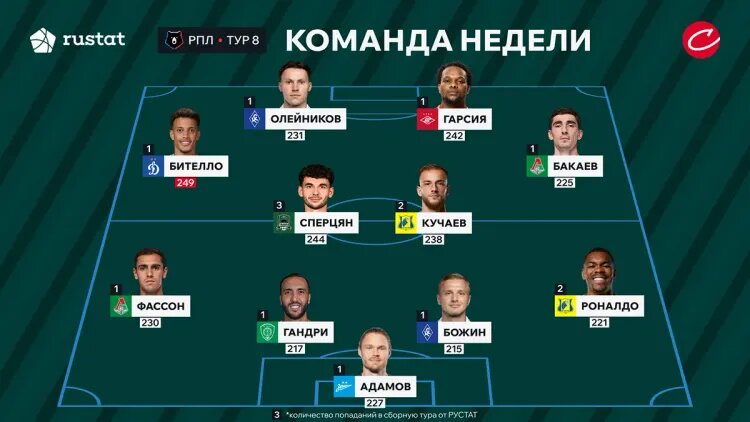 И это говорит о том, насколько плох был петербуржский клуб. А вот Сперцян номинирован в третий раз. «Советский спорт» в сотрудничестве с РУСТАТ представляет символическую сборную восьмого тура РПЛ. Адамов спас для сине-бело-голубых ничью в Калининграде, выполнив два сложнейших сейва. На исходе часа игры вратарь среагировал на удар Сергея Пряхина пяткой, а на последней компенсированной минуте выручил после удара Чинонсо Оффора с минимальной дистанции. Бразилец в этом сезоне относится к числу резервных футболистов красно-зелёных, однако по ходу матча с «Ахматом» третий номер удачно вышел на фланг обороны. В частности, за 40 игровых минут Фассон отдал зрячий пас на край вратарской, создав момент для Александра Сильянова, а также выполнил предголевую передачу в эпизоде, который увенчался точным ударом Алексея Батракова. Вдобавок Лукас точно отдал 20 из 21 паса – хорошая заявка на попадание в основной состав. Лидер обороны грозненцев во встрече с «Локомотивом» выиграл 10 из 13 единоборств,