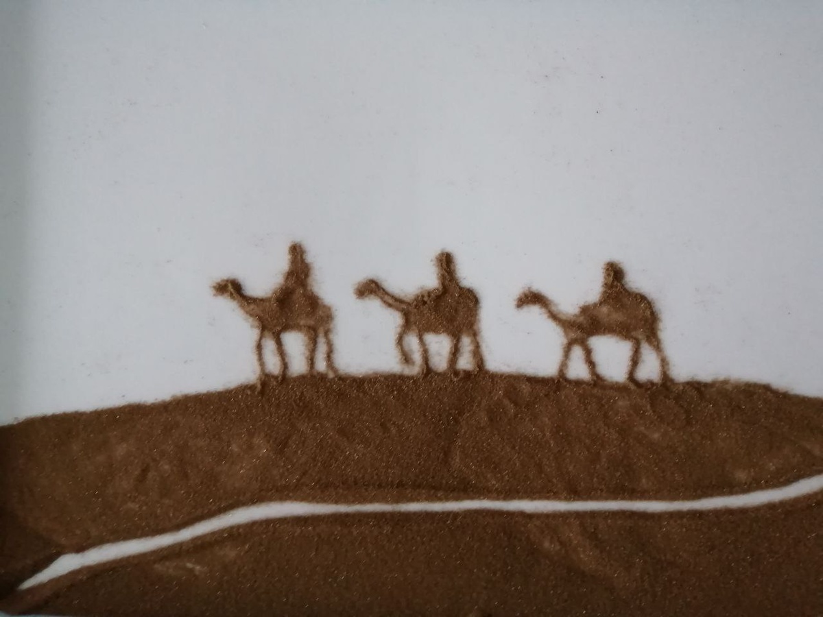 Середина дня, солнце находится над головой и ни одной тучки на небе, ветер как будто покинул эти места. Вокруг одни барханы полные песка, как будто бушующее море замерло, и превратилось в песок. Кажется, что бархан под тобой рухнет, как обрушивается большая волна на берег, и погребёт тебя, вместе с караваном верблюдов и их всадников.