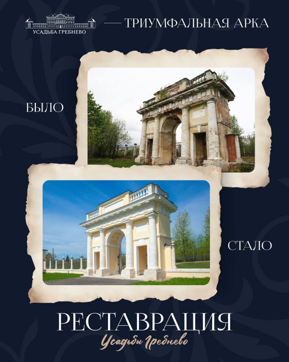 Главные въездные ворота усадьбы Гребнево, построенные в 1818–1819 годах по проекту архитектора Николая Дерюгина, обрели новую жизнь после реставрации. Ворота были созданы при князьях Голицыных, которые полностью перестроили усадьбу после приобретения её у генерала Бибикова в 1811 году. Они заменили старые готические ворота, упомянутые в описи того времени. Лепные работы выполнял мастер Рыбаков, а кованые чугунные решетки изготавливались на уральских заводах Голицыных (к сожалению, они не сохранились). Триумфальная арка выполнена в стиле ампир и украшена римско-дорическими колоннами, массивным антаблементом, парапетом с баллюстрадой, изящными, металлическими полотнищами в стиле позднего классицизма. В ходе реставрации восстановлены утраченные детали, однако скульптурные барельефы в нишах пока не воссозданы. Фото: Усадьба Гребнево