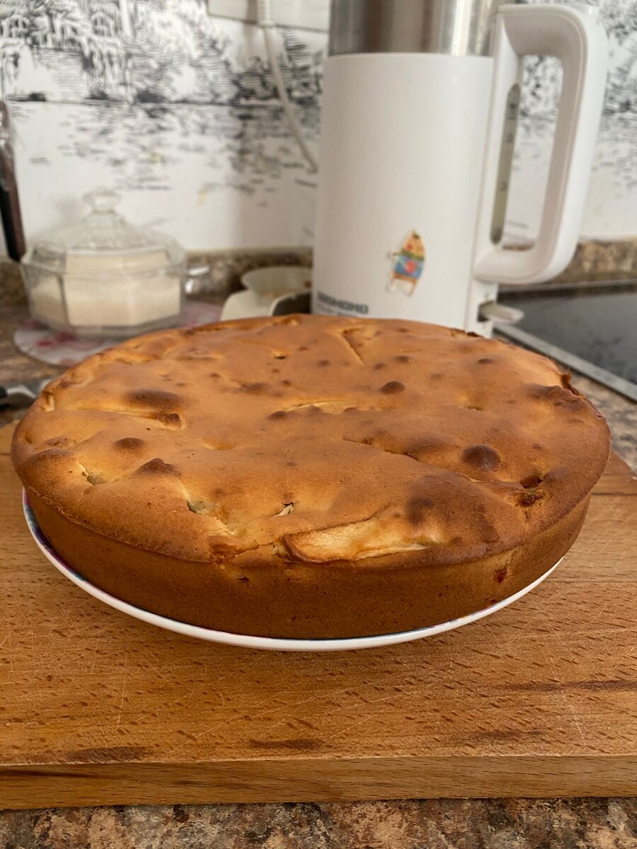 Состав : Муки 320гр Яйцо - 4 шт Сахара - 7 ст. л. Соли щепотку. Сметаны - 3 ст. ложки. Кефира - 150гр. Сода 1 чайная ложка. Уксус Разрыхлителя - 1 пачка Ванилин - 1пачка. Яблоки - 4шт. Сливочное масло - 50 гр. Приготовление: Яблоки предварительно моем, чистим и режим на кусочки. Тем временем подготавливаем тесто. Яйца взбиваем с сахаром, чтобы поменяли цвет, добавляем соль, соду гашенную в уксусе, ванилин, разрыхлитель, вливаем кефир, сметану. Добавляем сливочное масло, предварительно его растопив в микроволновке или любым другим способом.После того, как все ингредиенты добавлены, всыпаем муку предварительно просеев. Берём форму, смазываем размягченным маслом, вливаем немного теста, затем выкладываем яблоки, после этого вливаем оставшееся тесто, чтобы закрыть выложенный слой яблок. Выпекаем в духовке до готовности. Приятного аппетита!