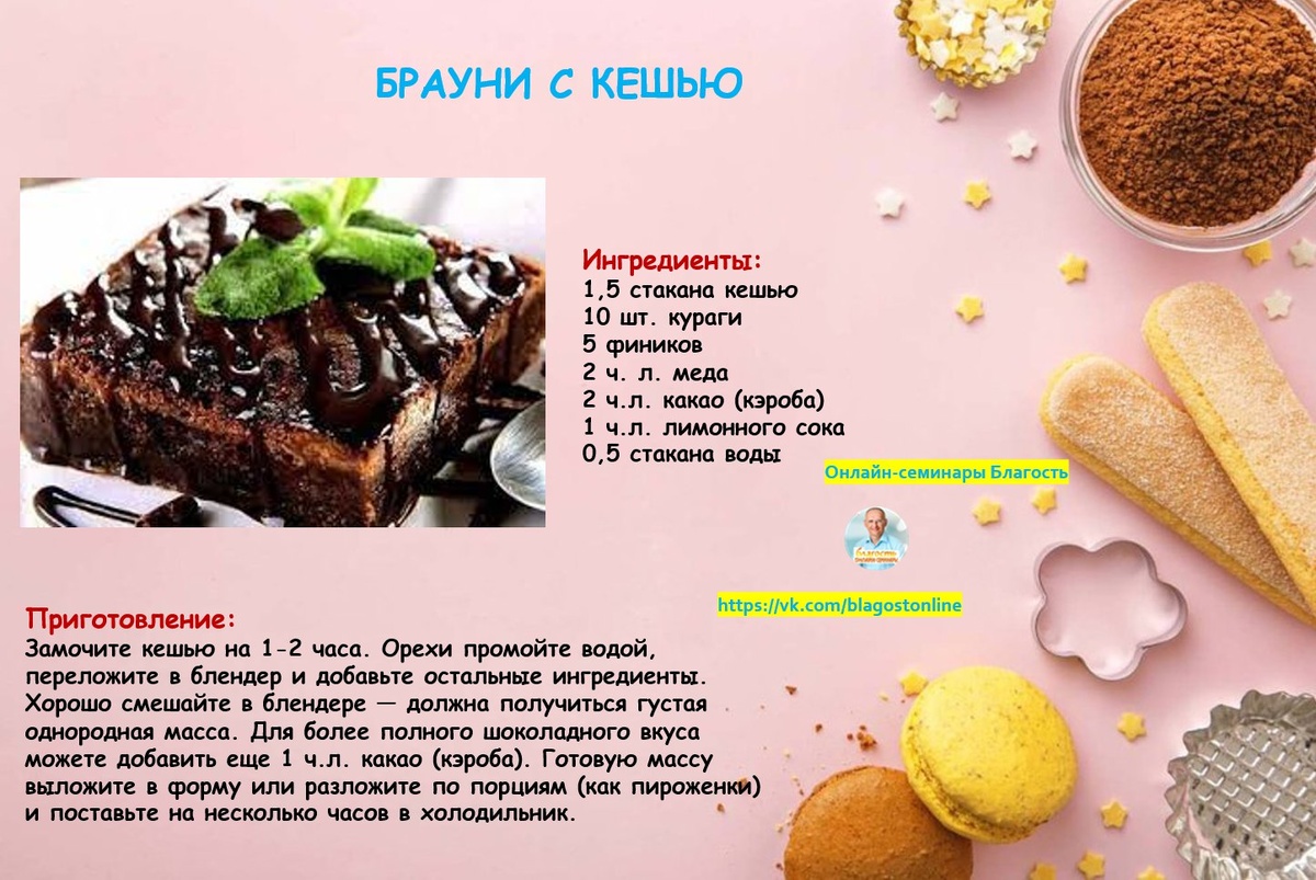 🍰 БРАУНИ С КЕШЬЮ 🌀 Ингредиенты: 1,5 стакана кешью 10 шт кураги 5 фиников 2 ч. л. меда 2 ч.л. какао (кэроба) 1 ч.л. лимонного сока 0,5 стак. воды 🌀 Приготовление: Замочите кешью на 1-2 часа. Орехи промойте водой, переложите в блендер и добавьте остальные ингредиенты. Хорошо смешайте в блендере — должна получиться густая однородная масса. Для более полного шоколадного вкуса можете добавить еще 1 ч.л. какао (кэроба). Готовую массу выложите в форму или разложите по порциям (как пироженки) и поставьте на несколько часов в холодильник.