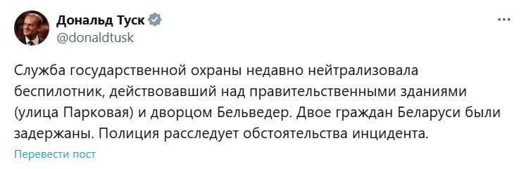 Над правительственными зданиями в Польше сбили дрон, — премьер Польши Туск. По его словам, задержаны два гражданина Беларуси. Обстоятельства инцидента расследует полиция.