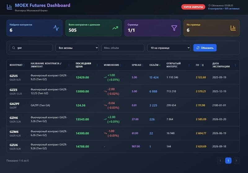 Это web-приложение с современным дизайном в популярной сейчас тёмной теме показывает информацию обо всех фьючерсах Московской биржи ММВБ.