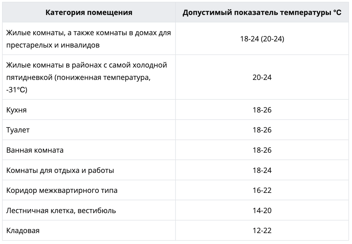 Как и в весенний период, осенью погода постепенно сменяется на холодную, вследствие чего инженерам управляющей компании стоит следить за температурными показателями обоих сезонов. Есть 2 варианта по ГОСТ 30494-2011 и СанПиН 1.2.3685-21 (п. 91):