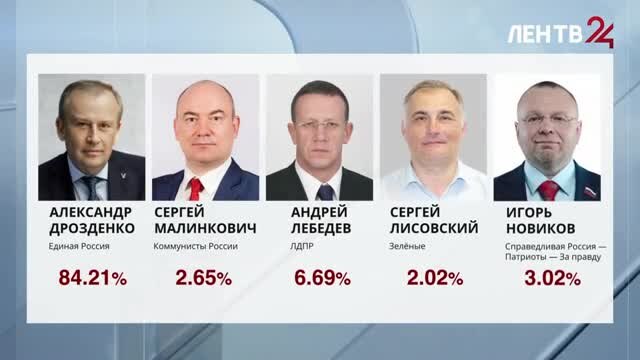 В 47-м регионе завершились выборы губернатора Ленинградской области. Явка избирателей превысила 62%. Об итогах голосования и о том, как регион справился с попытками сорвать голосование извне, — в материале корреспондента ЛенТВ24 Вероники Ерзянкиной. Губернаторские выборы в Ленобласти завершились уверенной победой Александра Дрозденко. Предварительные итоги Леноблизбирком озвучил на пресс-конференции в ТАСС. По результатам голосования кандидат от партии «Единая Россия» набрал 84,21% после обработки всех протоколов. Это более 756 тысяч голосов избирателей. В 2020 году явка была 51,52%, и проголосовало за губернатора, за него было 83,61%, а проголосовало на тот момент 585 тысяч 831. Это 20-й год, то есть предыдущие выборы. Поэтому считаю, что, опять же, было 83,61%, сейчас 84,21%, то есть, в принципе, примерно в этих же параметрах, если мы говорим о процентном соотношении, но не в процентном соотношении за него проголосовало почти на 200 тысяч больше.Михаил Лебединский, председатель избир
