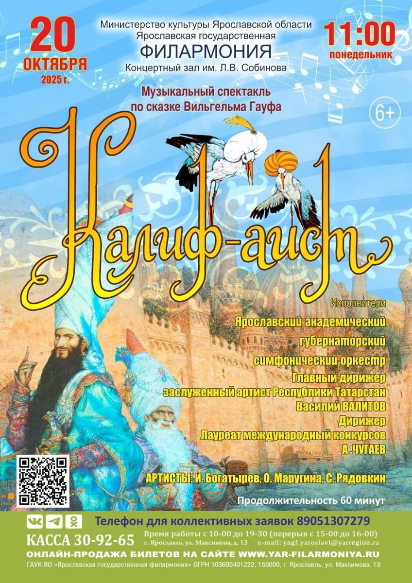 🎭 🎺🥁🎻 Ярославский академический губернаторский симфонический оркестр приглашает вас в удивительное путешествие по страницам любимых сказок! Спешите приобрести билеты на незабываемые концерты для всей семьи! 🍁🍂🍁🍂В программе октября🍂🍁🍂🍁: * «Калиф-аист» — захватывающая сказка Вильгельма Гауфа о приключениях восточного правителя, который с помощью волшебного порошка превращается в аиста. Вас ждёт увлекательное повествование о дружбе, верности и чудесах Востока под чарующую музыку оркестра. * «Аистёнок и пугало» — добрая и поучительная история по мотивам произведения Л. Лопейской и Г. Крчуловой о дружбе необычного аистёнка и одинокого пугала. Музыка поможет раскрыть все тонкости этой трогательной истории. * «Щелкунчик» — волшебная рождественская история под бессмертную музыку Петра Ильича Чайковского: ❄Знаменитый танец феи Драже ❄ Захватывающее сражение с Мышиным королём ❄Вальс цветов ❄Волшебный мир сладостей и др. * «Красная Шапочка» — классическая история Шарля Перро в но