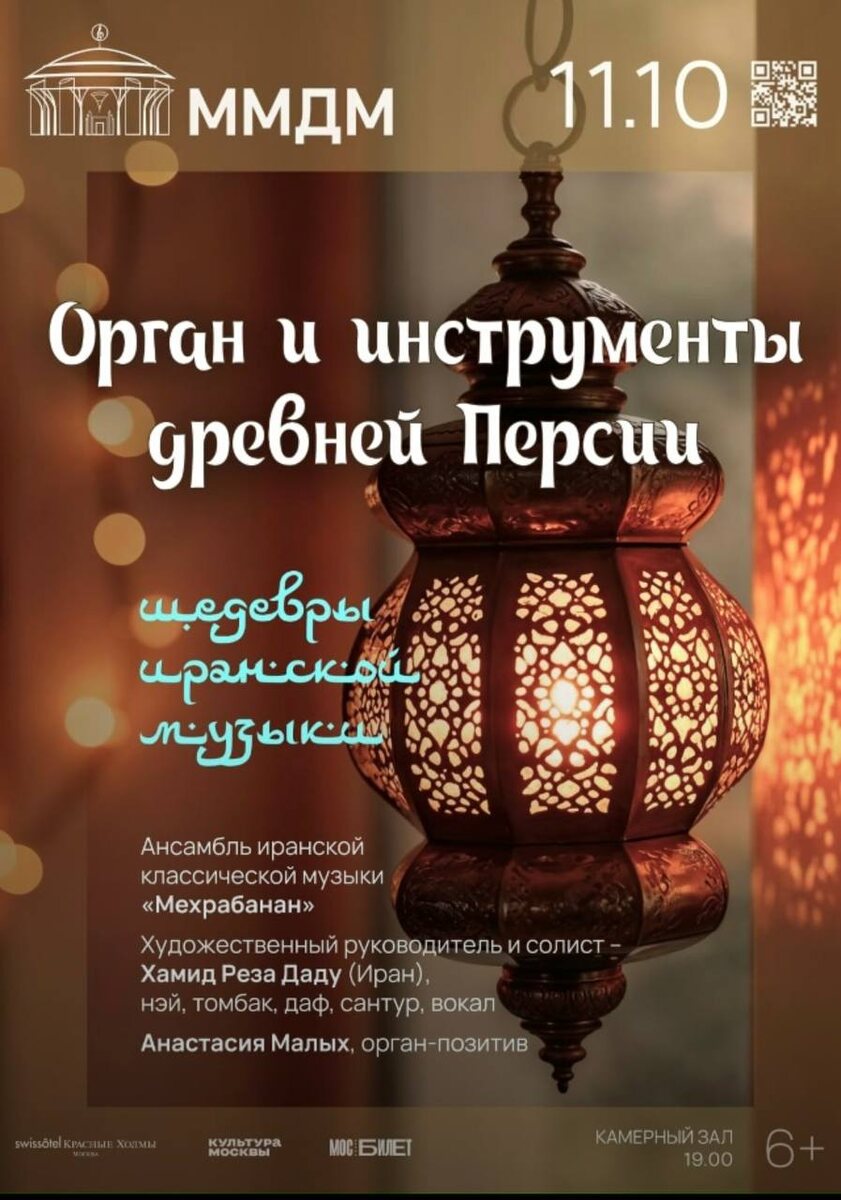 Большой концерт «Орган и инструменты Древней Персии» в Московском Международном Доме Музыки. Позвольте пожалуйста Вам сообщить, что 11 октября в 19:00 состоится прекрасный, неповторимый, душевный и уникальный концерт иранской классической музыки совместно с органом в камерном зале Московского Международного Дома Музыки. В этот потрясающий вечер со мной играют талантливые музыканты и вокалисты из Ирана и России. Прозвучат шедевры иранской классики в исполнении Ансамбля иранской классической музыки "Мехрабанан" под сопровождение органа-позитив. Ансамбль "Мехрабанан" выступит на этом концерте своим большим составом: Хамид Реза Даду - художественный руководитель и солист ансамбля иранской классической музыки « Мехрабанан» (томбак, сантур, даф, вокал) Анастасия Малых (орган) Любовь Завьялова (фортепиано) Александр Маломожнов (скрипка) Екатерина Миронова (виолончель) Мария Кулакова (арфа) Анастасия Кутюхина (скрипка) Амин Исмаиллу (скрипка) Ясаман Гейболахи (вокал) С нетерпением ждем Вас. Пр