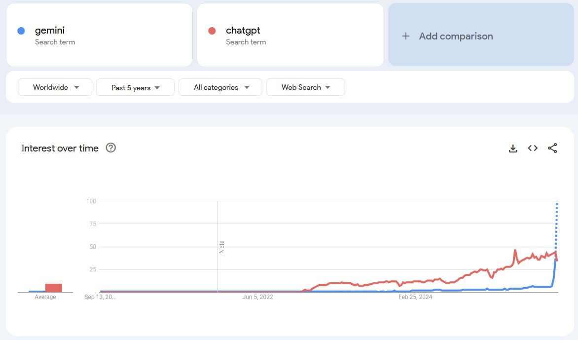 Gemini обгоняет openAI по популярности. Удивительно, но факт. Сам работаю с Gemini и отмечу - очень хорошее качество. На картинке тренд по поисковым запросам.