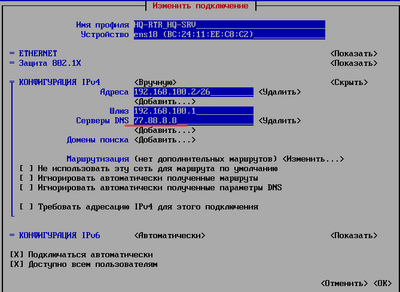 Настройка DNS для офисов HQ и BR. Для установки пакетов bind и bind-utils в настройках HQ-SRV добавим адрес DNS- сервер Устанавливаем пакета DNS-сервера bind # dnf install bind bind-utils Редактируем конфигурационный файл /var/named.conf # nano /etc/named.conf В данном файле необходимо изменить следующие строки, содержащие listen-on port 53;