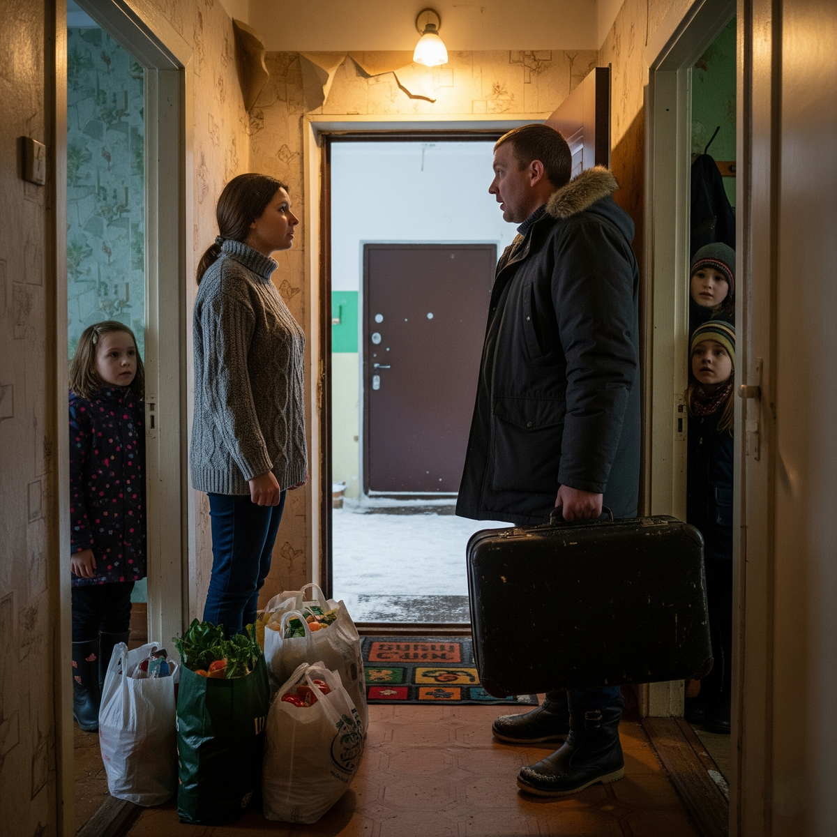 Вика пришла домой с сумками — хлеб, молоко, влажные салфетки, тетрадки для Сашки и наклейки для Милы. В прихожей — чемодан. Андрюша, её муж десяти лет, стоял в куртке, будто на пороге чужой квартиры, и на лице у него было то выражение, которым люди прикрывают собственную трусость.