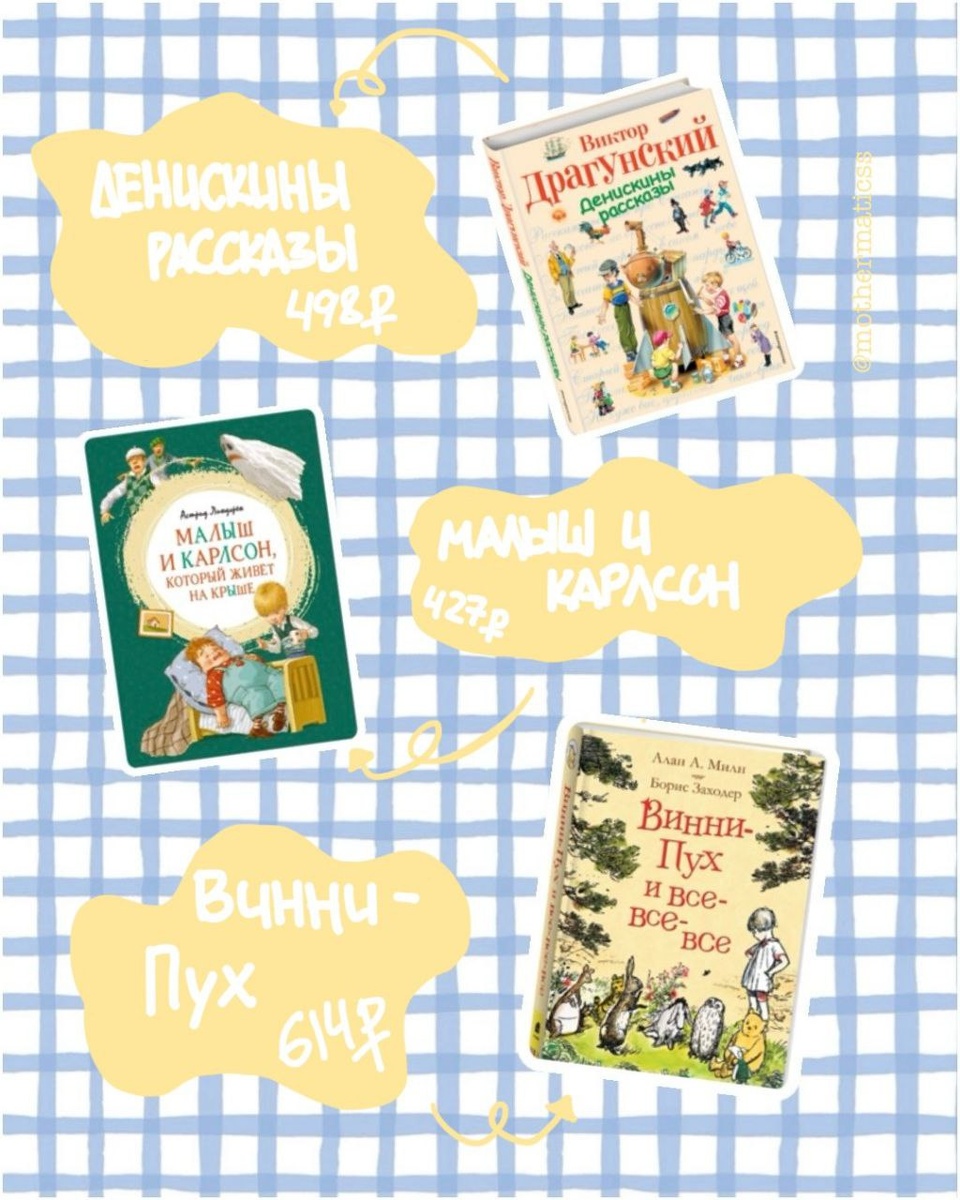 "Груффало" и "Котенок Шмяк" — это, конечно, здорово и модно, но что может быть лучше детской классики? Той самой, что читали в детстве мы 📘 #АдмиНадя на днях читала сыну сказки Сутеева, и аж мурашки шли от родных сердцу рисунков и историй☺️ 📚 Давайте вспомним этих замечательных авторов и их книги. 📎Сохраняйте подборку, чтобы не потерять. 🔵Виктор Драгунский "Денискины рассказы" 🔴Астрид Линдгрен "Малыш и Карлсон, который живёт на крыше" 🔵Алан А. Милн "Винни-Пух и все-все-все" 🔴А.Н. Толстой "Золотой ключик или приключения Буратино" 🔵Эдуард Успенский "Дядя Федор, пёс и кот" 🔴Григорий Остер "Котенок по имени Гав" 🔵Самуил Маршак "Сказки и стихи для малышей" 🔴Григорий Остер "Приключения Пифа" 🔵Валентин Катаев "Цветик-семицветик" 🔴Джоэль Харрис "Сказки дядюшки Римуса" 🔵Зденек Милер "Кротик и все-все-все" 🔴Владимир Сутеев "Сказки" 🔵Туве Янссон "Муми-тролли" 🔴Андрей Усачев "Все-все-все об умной собачке Соне" 🔵Корней Чуковский "Мойдодыр" 🔴Николай Носов "Приключения Незнайки