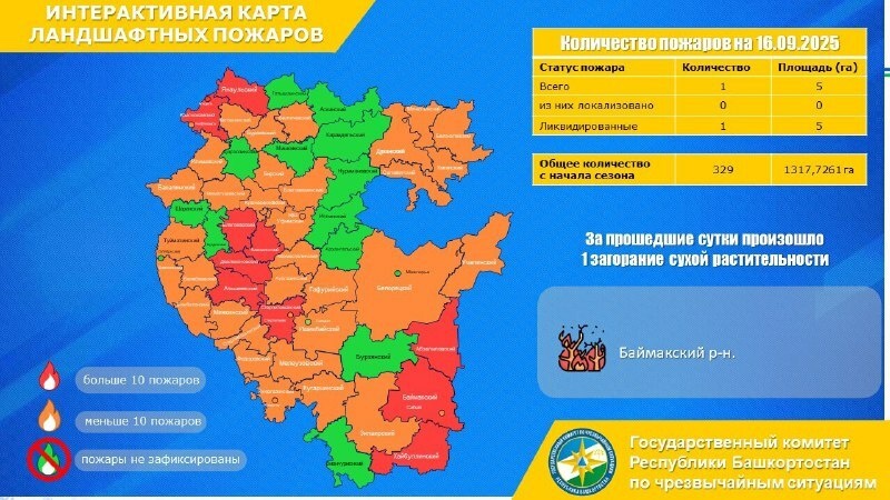 В Башкирии за прошедшие сутки ликвидировали одно загорание сухой травы в Баймакском районе, в селе Ургаза.
