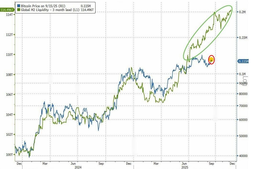 Обновление по динамике изменения глобальной ликвидности #M2 и курсу #BTC M2 опять ускорила рост. Так что если историческая положительная корреляция сохранится, то у BTC есть высокие шансы возобновить рост и обновить рекорд после боковика/коррекции