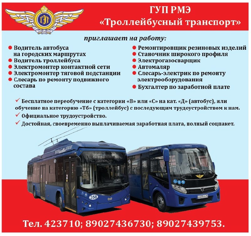ГУП РМЭ «Троллейбусный транспорт» приглашает на работу: ♦️ Водитель автобуса на городских маршрутах, ♦️ Водитель троллейбуса, ♦️ Электромонтер контактной сети, ♦️ Электромонтер тяговой подстанции, ♦️ Слесарь по ремонту подвижного состава, ♦️ Ремонтировщик резиновых изделий, ♦️ Станочник широкого профиля, ♦️ Электрогазосварщик, ♦️ Автомаляр, ♦️ Слесарь-электрик по ремонту электрооборудования, ♦️ Бухгалтер по заработной плате, ♦️ Бесплатное переобучение с категории «В» или «С» на кат. «Д» (автобус), или обучение на категорию «Тб» (троллейбус) с последующим трудоустройством к нам. ✅ Официальное трудоустройство, достойная, своевременно выплачиваемая заработная плата, полный соцпакет. ☎️ Тел. 42-37-10; 8 (902) 743-67-30; 8 (902) 743-97-53. Подробности в группе Троллейбусный транспорт Марий Эл и на сайте