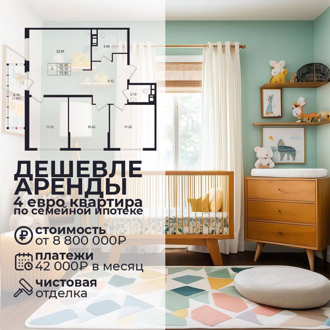 ТОЛЬКО 2 ДНЯ! Самое выгодное предложение для семей за все время. 4 евро квартира 72 м² с отделкой = всего за 42 000 рублей в месяц по семейной ипотеке. 👉Очень выгодное предложение, смотрите сами: ● Цена от 8 800 000 ₽ ● Чистовая отделка в подарок ● Круглосуточное видеонаблюдение на территории ● 4 детских сада и школа в районе Успейте купить по такой цене - такое предложение больше не повторится! Считайте сами: Платите 42 000 ₽ в месяц за свою современную квартиру, в то время как аренда аналогичной стоит от 55 000 ₽. ⚡️Это ваш шанс переехать в квартиру мечты всей семьей и сэкономить. Напишите мне - я отправлю презентацию ЖК и расчет платежа на твою квартиру.