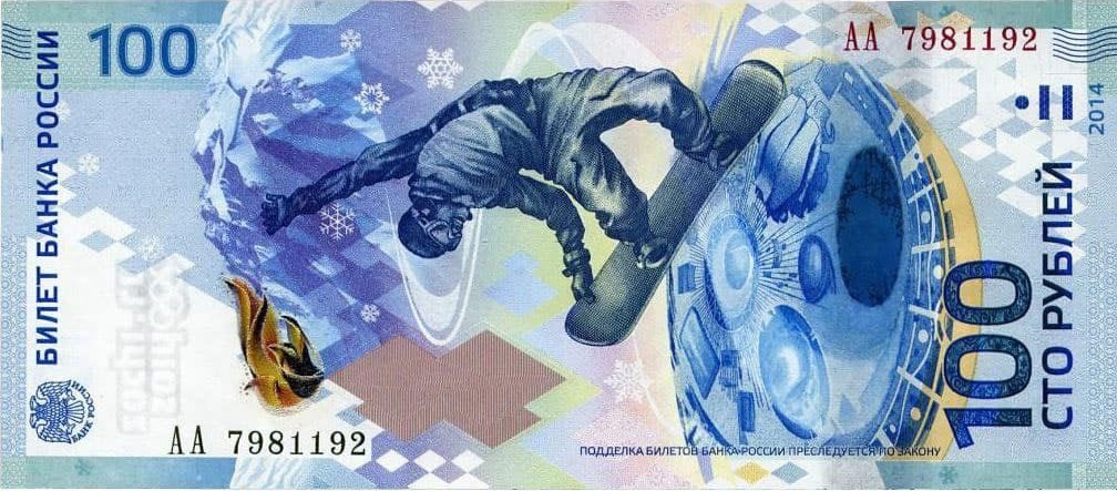 Бумажная сторублевая купюра посвященная Олимпийским играм в Сочи 2014 года стала настоящим подарком для коллекционеров. Отличным памятным сувениром для всех кто следил за олимпийскими баталиями на ледовых и снежных полях. Выпуск денежных знаков, на которых размещены логотип и символы олимпиады, является традиционным перед каждой Олимпиадой. Чаще всего к главному событию в мире спорта выпускают монеты. Однако после выпуска в 2008 году банкноты к Пекинской Олимпиаде, в ЦБ России решили также выпустить и бумажные денежные знаки, посвященные играм 2014 года в Сочи. Так к Сочинской Олимпиаде 2014 года отпечатаны банкноты номиналом в 100 рублей, которые имеют новый яркий и необычный дизайн. На одной её стороне изображен летящий в динамичном полете сноубордист над горнолыжным центром Роза Хутор в Красной Поляне города Сочи, а на другой жар-птица - символ чуда и красоты из русских народных сказок и фольклора. Кроме того олимпийские 100 рублей отличается еще и новой для бумажных денежных знако