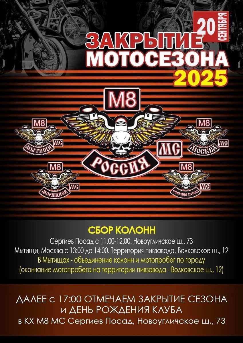 20 сентября мытищинские байкеры закроют мотосезон. По Мытищам пройдет небольшой мотопробег с финишем у пивзавода на аллее памяти.
