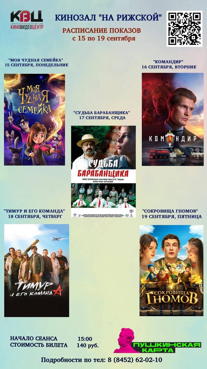 🌿 Кинозал «На Рижской" - осеннее расписание с 15 по 19 сентября! Ждем всех в Саратовском областном методическом киновидеоцентре! 🔗 Начало в 15.00. 🔖 Стоимость билета 140 рублей. 🔔 Подробности по телефонам: (8452) 62-31-98, (8452) 62-02-10
