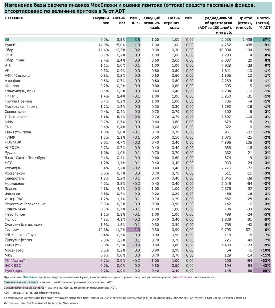 Как акции X5 вырастут на включении в индекс Как акции X5 вырастут на включении в индекс Акции X5 Group уже на этой неделе добавят в базу расчета индекса Мосбиржи. А это значит, что пассивные фонды, следующие за индексом, будут обязаны купить бумаги компании в свои портфели. Аналитики SberCIB посчитали, сколько денег придет в X5 уже 18 сентября. Всего под управлением пассивных фондов, следующих за индексом Мосбиржи находится около 43 млрд рублей. X5 добавили в индекс с весом 3,5%, а значит в акции будет вложено 3,5% от 43 млрд или 1,5 млрд рублей. Среднедневной оборот торгов за 100 дней у X5 составляет 2,2 млрд рублей, а это значит, что приток средств составит около 67% дневного оборота. Если смотреть на кейсы Мать и Дитя и Совкомбанка, то можно заметить, что приток покупок в размере около 10% среднедневного оборота приводит к росту акций на 1%. А это значит, что акции X5 могут вырасти на включении в индекс примерно на 7%. Но и это еще не все. Не будем забывать, что до конца г
