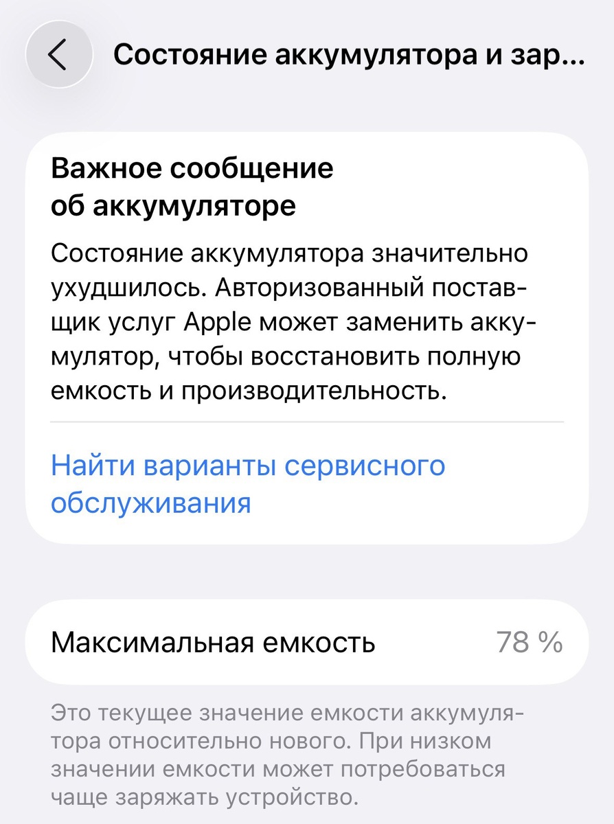 Решили посмотреть что там у нас показывает в настройках Аккумулятор после установки iOS 26. И вот пожалуйста! А ведь еще на прошлой неделе было что-то там 82-83 процента и «ничто не предвещало беды».