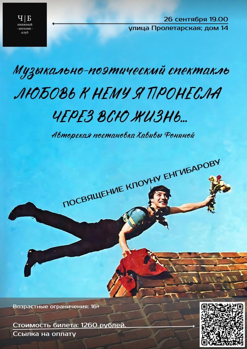 26 сентября в 19.00 в книжном магазине-клубе Ч|Б состоится моноспектакль по пьесе Хавивы Фониной "Любовь к нему я пронесла через всю жизнь", посвящена клоуну Леониду Енгибарову. Это романтическое путешествие главной героини длиною в жизнь, в котором с ней повсюду рядом ее верный друг — клоун-игрушка. Сцены грусти сменяются юмором, а ностальгия - верой в чудо. И только любовь, которая несмотря ни на что, горит в её сердце, заставляет идти навстречу к мечте. В спектакле звучат авторские стихи и песни на слова Хавивы Фониной. Возрастные ограничения: 16+ Стоимость билета: 1290 рублей Приобрести билет можно по куар-коду на афише или ТУТ , на кассе книжного или на портале АФИША.РУ ⏩ по ССЫЛКЕ Адрес: г. Звенигород, ул. Пролетарская, дом. 14 (вход со стороны остановки)