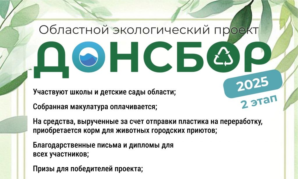 С 8 сентября в Ростовской области стартовал второй этап эколого-просветительского проекта «ДОНСБОР-2025». Участникам проекта предлагают сдать бумагу и пластиковые крышки в переработку. Вырученные деньги пойдут на благотворительность: на них закупят корма для животных в приютах. Проект реализуется при поддержке Министерства природных ресурсов и экологии Ростовской области и регионального оператора «ООО Экоград-Н». Участие в нем могут принять школы и детские сады Ростовской области. Минимальный необходимый вес макулатуры для участия: 500 кг для школы и 200 кг для детского сада. О желании учреждения принять участие в проекте необходимо сообщить до начала процесса сбора макулатуры и пластика. Сдать собранное вторичное сырье можно до 14ноября 2025 года. Затем будут подведены итоги, а также поощрены самые активные участники. За ходом реализации проекта можно следить на сайте donsbor.ru Все учреждения, участвующие в проекте, награждаются благодарственными письмами и почетными грамотами. Самые
