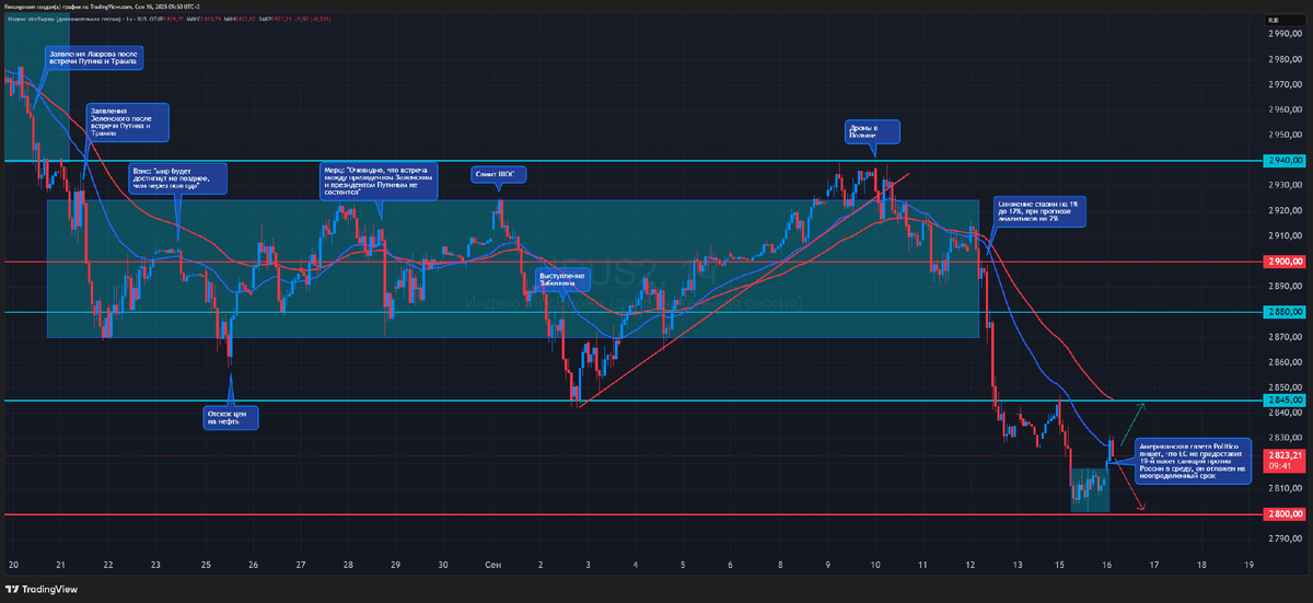 На фоне этого, индекс МосБиржи пришёл к моему целевому ориентиру – 2800 пунктов. Около уровня поддержки по рынку акций началась фиксация прибыли. Наблюдались попытки отскока рынка. Тем не менее, индекс не смог обновить внутридневные максимумы около 2818 пунктов.