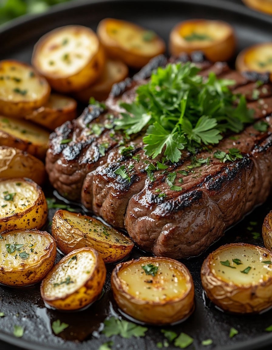 Стейк с картошкой. Промпт: Изображение представляет собой фотографию изысканного блюда крупным планом в высоком разрешении, на которой стейк, идеально приготовленный на гриле, занимает центральное место. Стейк получается толстым, сочным, прожаренным до средней прожарки, с насыщенным коричневым оттенком и заметными следами гриля. Сверху стейк щедро посыпают свежей зеленью петрушки. Стейк украшают золотисто-коричневыми дольками жареного картофеля, покрытыми легким слоем масла и приправ. Блюдо подается на белой керамической тарелке с коричневой каемкой, установленной на деревянном столе в деревенском стиле. На заднем плане виден небольшой глиняный горшочек со сливочным золотисто-коричневым соусом и пучок свежей петрушки, добавляющий нотку зелени. Общая композиция получается теплой и располагающей, подчеркивая богатую текстуру и цветовую гамму блюда. Нейросеть: Алиса #нейросеть #цифровоефото #арт #рисунок #DigitalDreamscapes #цифроваяживопись #артыотнейросетей #DIY #нейроарт #идеи #digi