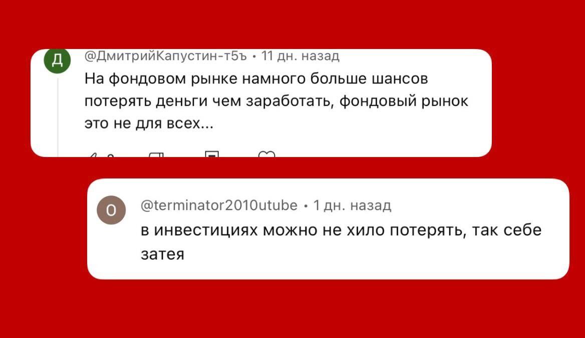 ⚠️В инвестициях можно не только заработать, но и потерять. И это правда👇 Разбираем комментарии. Каждый, кто пишет такой комментарий, не понимает разницы инвестиционных инструментов. ▶️ Сейчас объясню про возможность потерять деньги на фондовом рынке, по шкале от самого жесткого финансового инструмента, до самого надежного. 1️⃣ Фьючерсы и опционы. Если вы когда-то слышали, что человек потерял ВСЕ деньги, а может даже остался должен (да, и такое бывает) - всему виной были фьючерсы и опционы. При торговле фьючерсами и опционами используется гарантийное обеспечение, когда вы торгуете на бОльшую сумму, чем у вас есть реальных денег. И используете кредитное плечо. Это очень увеличивает потенциальную доходность (сколько вы можете заработать), но также и потенциальные убытки. Фьючерсы и опционы используют опытные инвесторы и трейдеры, и даже они часто теряют деньги на них. Но опытные инвесторы умеют просчитывать риски и не идти «во банк», а торгуют небольшими долями от портфеля. А нови