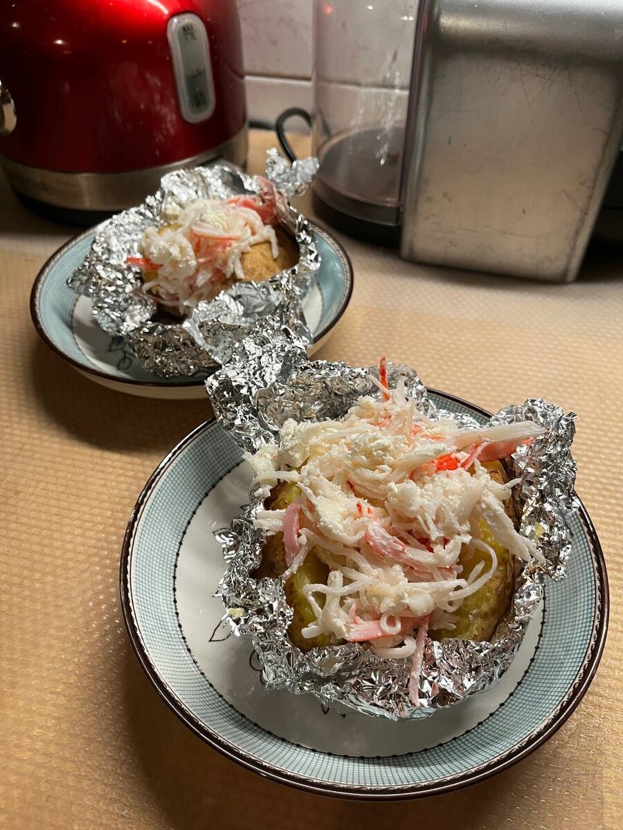 Что касается начинки — тут всё зависит от фантазии. У меня был вариант с крабовым мясом и сыром фета. После того как картошка готова, просто разрезаем её пополам, кладём начинку и подаём.