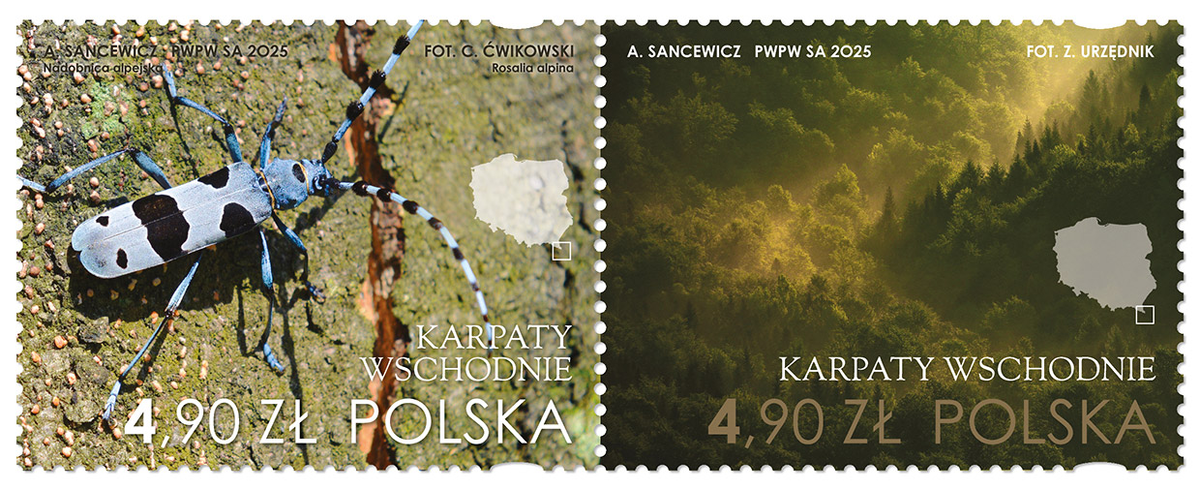 15 сентября 2025 года почта Польши выпустила серию почтовых марок "Восточные Карпаты". Серия почтовых марок, посвященная Восточным Карпатам и Бещадскому национальному парку, показывает неповторимую красоту природы региона – от редких видов насекомых до величественных горных пейзажей. На марках изображены; Альпийский усач - характерное насекомое из семейства жуков-лонгхорнов, с голубовато-серой окраской с черными пятнами. Альпийский усач является охраняемым видом, встречающимся в основном в старых буковых лесах Карпат, в Польше наиболее обильно в горах Бещады. Это символ биоразнообразия региона и его природного наследия. Царынская поляна - это живописный пейзаж одного из самых красивых горных пастбищ в Бещадах – Полонина Царынска. Она протянулась между Устшики-Гурне и Бжеги-Гурне, откуда открывается панорамный вид на горные хребты и долины. Полонина известна своим богатством флоры, в том числе редкими видами альпийских растений, а также уникальными условиями для пеших прогулок и наблю