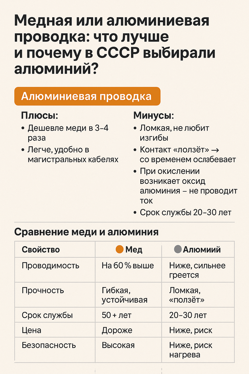 При ремонте или строительстве встаёт вопрос: какую проводку выбрать? В советских домах до сих пор часто встречается алюминий, а современные нормы требуют медь. Разберёмся, чем они отличаются и в чём главные плюсы и минусы. Плюсы: Минусы: Плюсы: Минусы:
