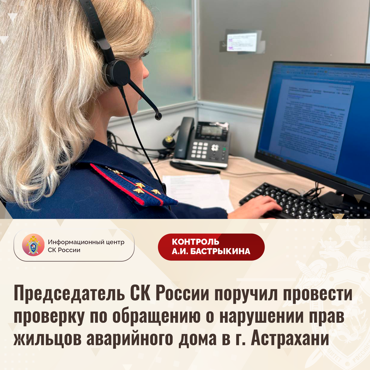 Председатель СК России поручил провести проверку по обращению о нарушении прав жильцов аварийного дома в г. Астрахани На единую многоканальную телефонную линию Информационного центра СК России обратилась жительница города Астрахани по вопросу длительного нерасселения многоквартирного дома на улице Таганской. Женщина и ее супруг являются единственными жильцами деревянного двухэтажного здания барачного типа 1894 года постройки, признанного аварийным в 2019 году. В прошлом году суд обязал предоставить семье жилое помещение установленной площади, однако до настоящего времени права заявительницы не реализованы. Обращения в компетентные органы результатов не принесли. Председатель Следственного комитета Российской Федерации Александр Иванович Бастрыкин поручил и.о. руководителя СУ СК России по Астраханской области Владимиру Георгиевичу Смирнову провести процессуальную проверку и доложить о ее предварительных и окончательных результатах. Исполнение поручения, а также ход процессуальной прове