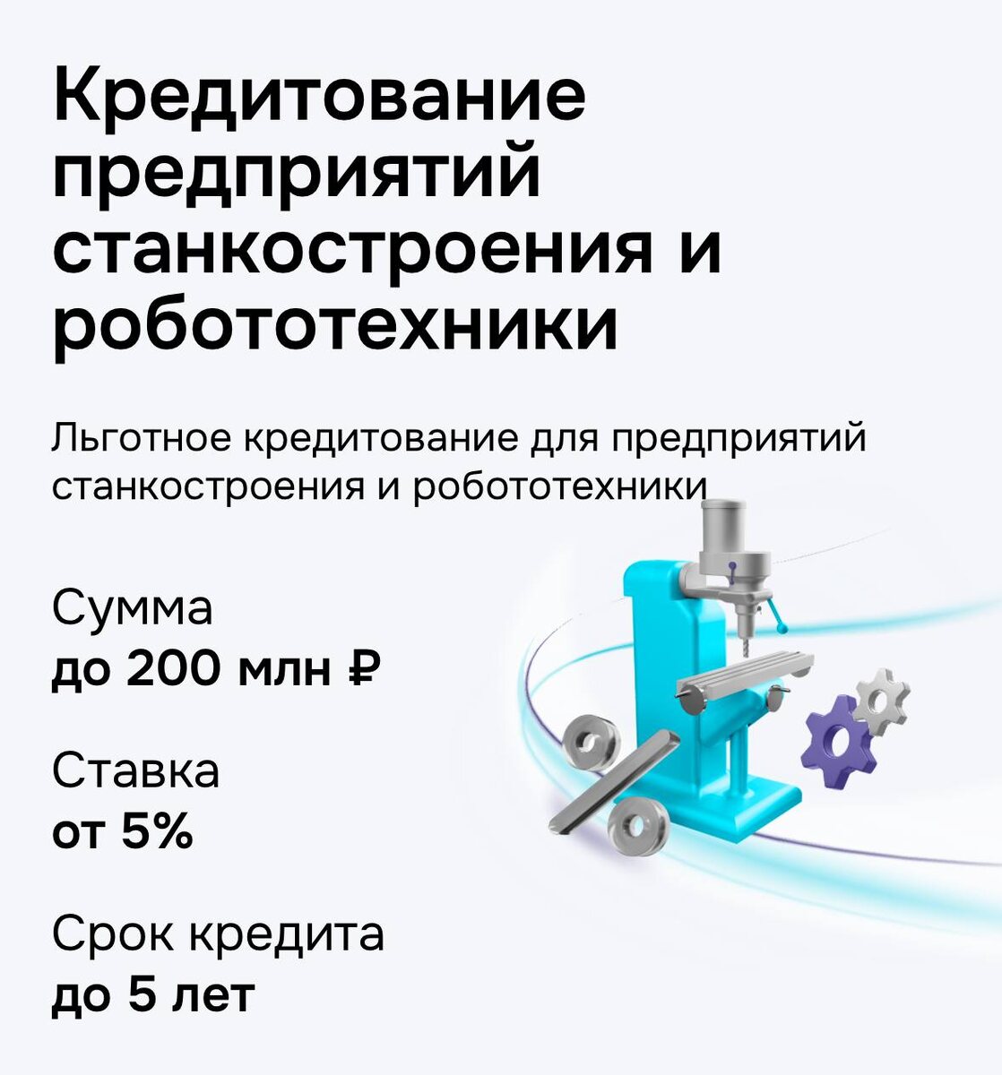 ⚡️МСП: Вслед за снижением ставки рефинансирования снижает проценты по программе льготного кредитования предприятий станкостроения и робототехники Цель кредитования: ✅ инвестиционные цели ✅пополнение оборотных средств Льготные ставки действуют в течение 3-х лет: 1-й год: 5% годовых 2-й год: 9,5% годовых (половина ключевой ставки ЦБ РФ + 1% на дату начисления процентов) 3-й год: 11,5% годовых (половина ключевой ставки ЦБ РФ + 3% на дату начисления процентов) Сумма: от 30 до 200 млн ₽ Срок кредита: ✅до 36 месяцев пополнение оборотных средств ✅до 60 месяцев на инвестиционные цели Обеспечение: - для юридических лиц — поручительство собственников бизнеса - для ИП поручительство не требуется - залог объектов недвижимости - залог транспортных средств - залог в виде интеллектуальной собственности - иные виды обеспечения в соответствии с условиями кредитования МСП Банка Дополнительно: - без обязательного страхования кредита - комиссия за выдачу кредита отсутствует Наши эксперты помогут под
