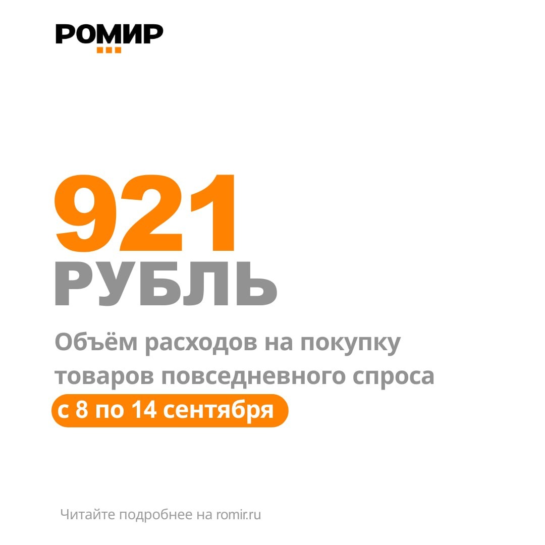 921 рубль составил размер среднего чека на прошедшей неделе с 8 по 14 сентября. Это на 11 рублей, или 1,24%, больше, чем неделей ранее, и на 71 рубль, или на 8,35%, больше, чем за аналогичную неделю прошлого года. 🔸В первые две недели сентября этого года объем расходов на покупку товаров повседневного спроса держится на одном уровне, рост на 1,24% находится в зоне статистической погрешности. #индекссреднегочека @romir_real