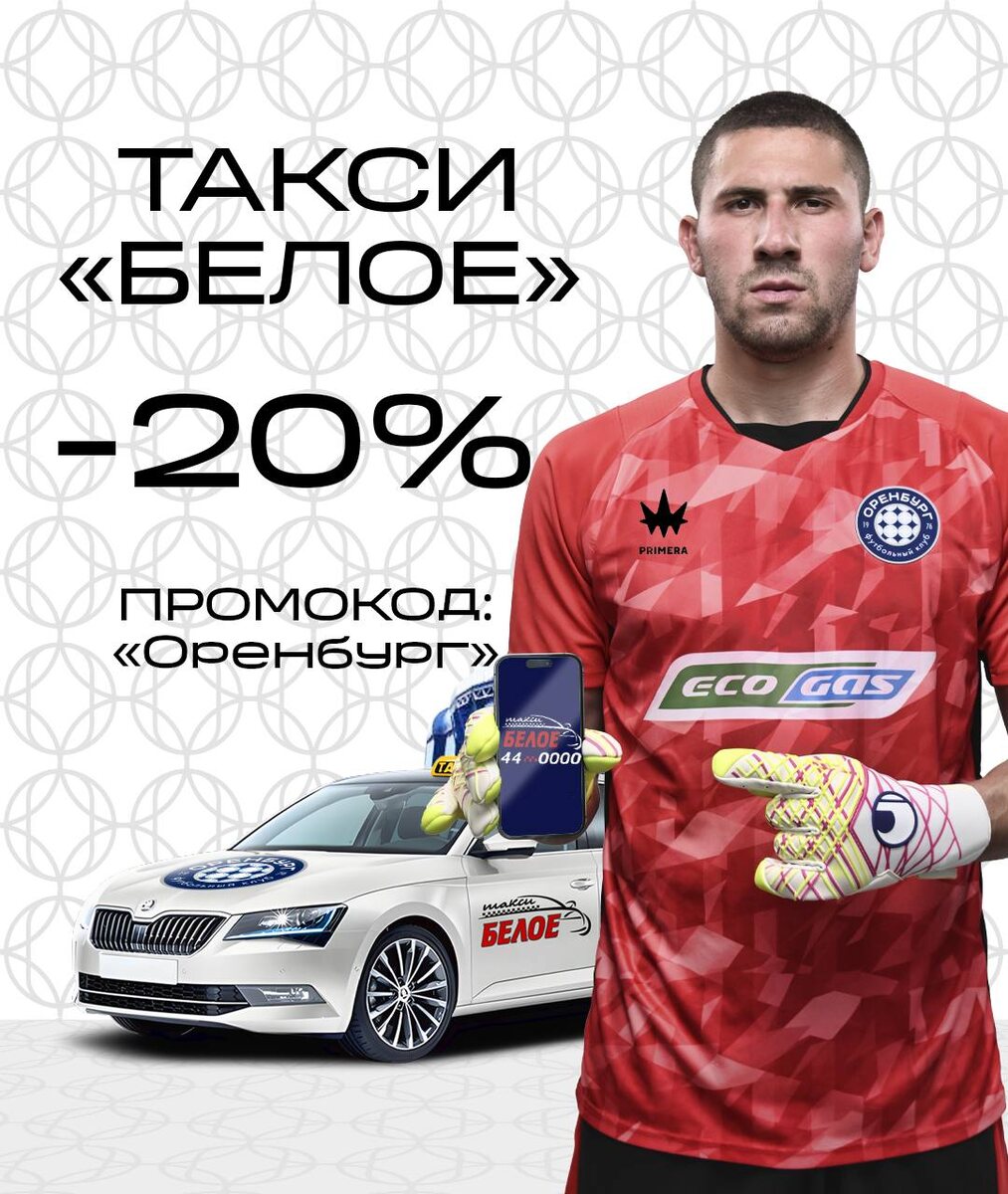 На футбол с комфортом! 🚕 Используй промокод «ОРЕНБУРГ» и получи 20% скидку на проезд до стадиона! 🏟️ Промокод доступен в приложении и по телефону 440-000 После матча на ул. Березовая Ростошь автомобили «Такси Белое» с комфортом отвезут вас домой по тому же промокоду😉