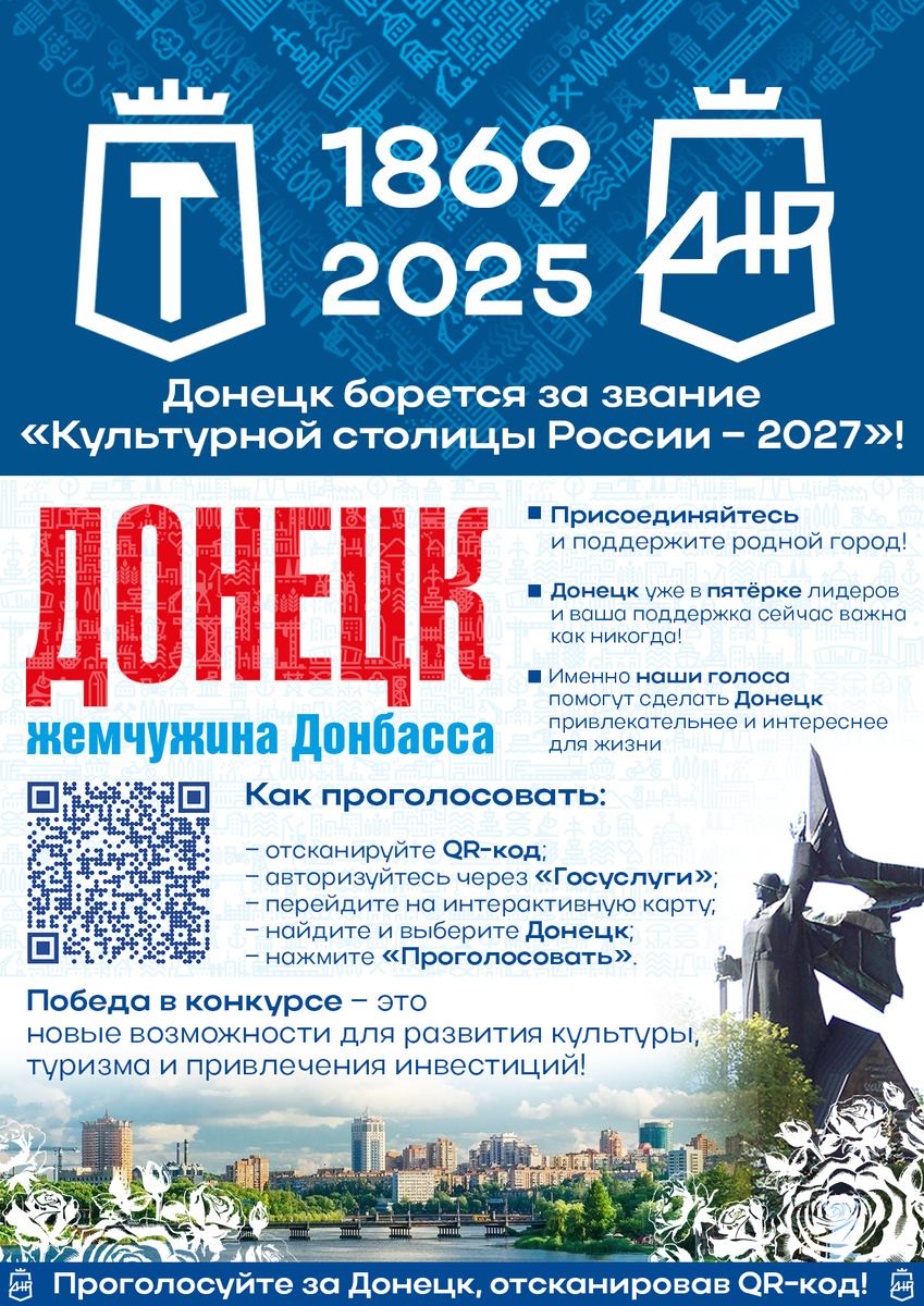 Вы можете поддержать Донецк в голосовании на портале «Госуслуги» по ссылке - https://pos.gosuslugi.ru/lkp/cultural-capital/contest/13/request/142/?clckid=a5ee02bb.