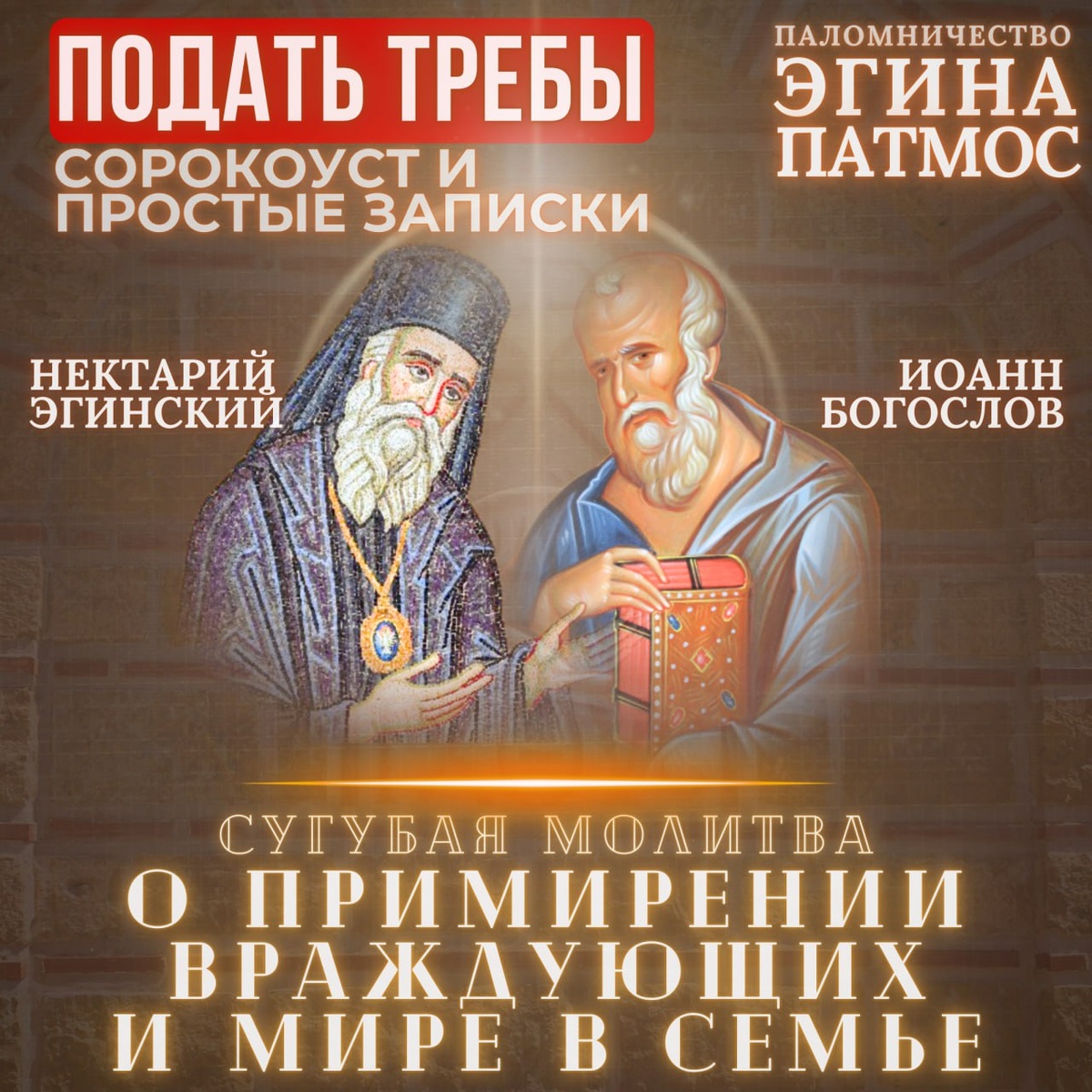 🙏 ПАЛОМНИЧЕСТВО ЭГИНА-ПАТМОС Семь молитв Нектарию Эгинскому и Иоанну Богослову сугубая молитва о семье и примирении враждующих назад Дорогие братья и сёстры! Завтра начинается паломничество, в ходе которого мы помолимся: 📌 на острове Эгина — у мощей святителя Нектария Эгинского 📌 на острове Патмос — апостолу Иоанну Богослову 🙏 Сугу́бые молитвы будут совершаться: — о примирении враждующих — о мире в семье и благополучии брака — об умножении любви ____ ✍️ Желающие могут подать записки на сайте: 👉 spyridon-rimini.ru/treba/ 📌 Все имена, поданные на сорокоуст будут помянуты в течение всего паломничества. 📌 Записки "В святом месте" будут помянуты однократно в один из дней паломничества. 📌 Все письма с просьбой или благодарностью будут оставлены: — 22 сентября — у мощей Нектария Эгинского — 26 сентября — в Пещере Апокалипсиса (Иоанн Богослов) ____ Как подать записки: 👉 Инструкция ❓ Ответы на частые вопросы Храни вас Господь!
