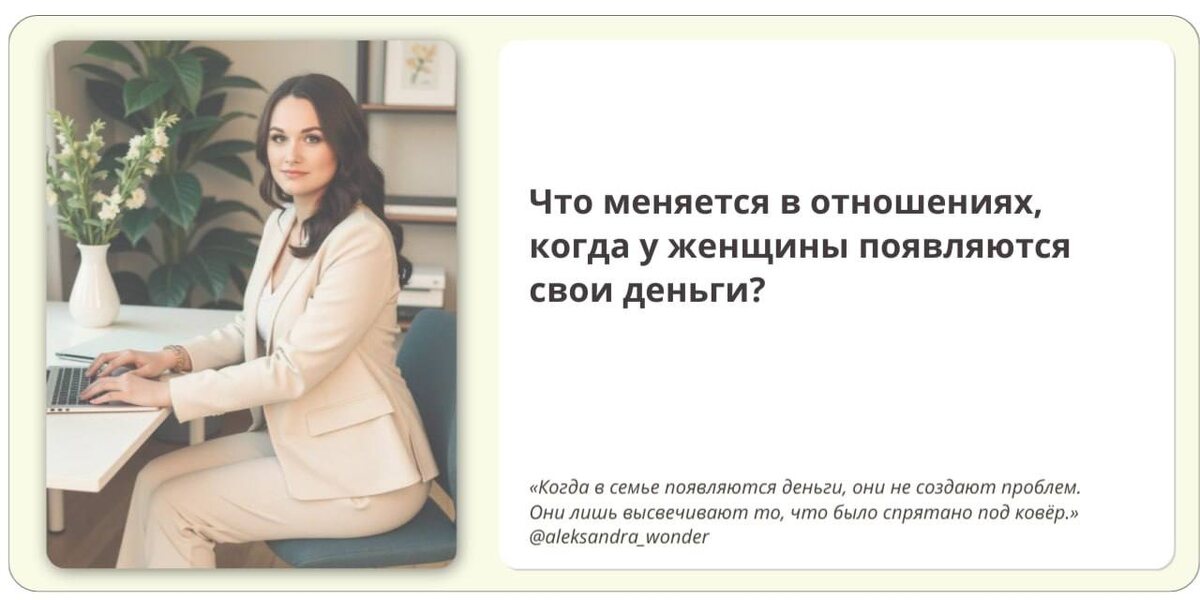 Что меняется в отношениях, когда у женщины появляются свои деньги? 🩶 Когда у женщины нет собственного дохода, даже если в семье всё благополучно и мужчина зарабатывает достаточно, внутри всё равно может жить ощущение зависимости. Это проявляется тонко: 🩶 «А могу ли я себе это позволить?» — даже если деньги общие. 🩶 Каждый раз приходится объяснять траты: «Дорогой, мне нужно платье» или «Хочу оплатить психолога». 🩶 Перед покупкой чего-то для себя автоматически возникает мысль: «А что он скажет?» 🩶 На большие расходы вроде отпуска или техники решение остаётся за ним, даже если формально он советуется. Даже без давления со стороны мужчины роли оказываются неравными: один «даёт», другая «берёт». Когда у женщины появляются свои деньги, динамика меняется. Она впервые ощущает, что может: 🩶 оплатить себе психолога, косметолога или курсы — не объясняясь; 🩶 купить то, что считает нужным — без ожидания «выделенных» денег; 🩶 вложить в развитие семьи или себя — из собственного ресурса.