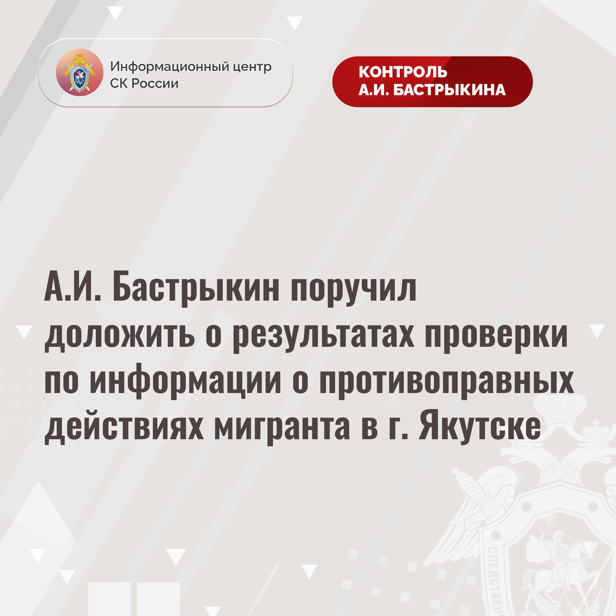 А.И. Бастрыкин поручил доложить о результатах проверки по информации о противоправных действиях мигранта в г. Якутске В телеграм-канале сообщается, что 14 сентября текущего года в городе Якутске водитель службы такси, являющийся мигрантом, во время выполнения заказа настойчиво пытался познакомиться с пассажиркой, угрожая ограничением свободы. В СУ СК России по Республике Саха (Якутия) по данному факту организована процессуальная проверка. Председатель Следственного комитета Российской Федерации Александр Иванович Бастрыкин поручил руководителю СУ СК России по Республике Саха (Якутия) Виталию Викторовичу Кондратенко доложить о результатах процессуальной проверки и установленных обстоятельствах. Исполнение поручения, а также ход процессуальной проверки поставлены на контроль в центральном аппарате ведомства. #СледственныйКомитет #СКРоссии #СКР #ИЦСКР #ИнформационныйЦентр #АлександрБастрыкин #ПредседательСКР #КонтрольПредседателяСКР #КомментарийКонтроль #Якутия