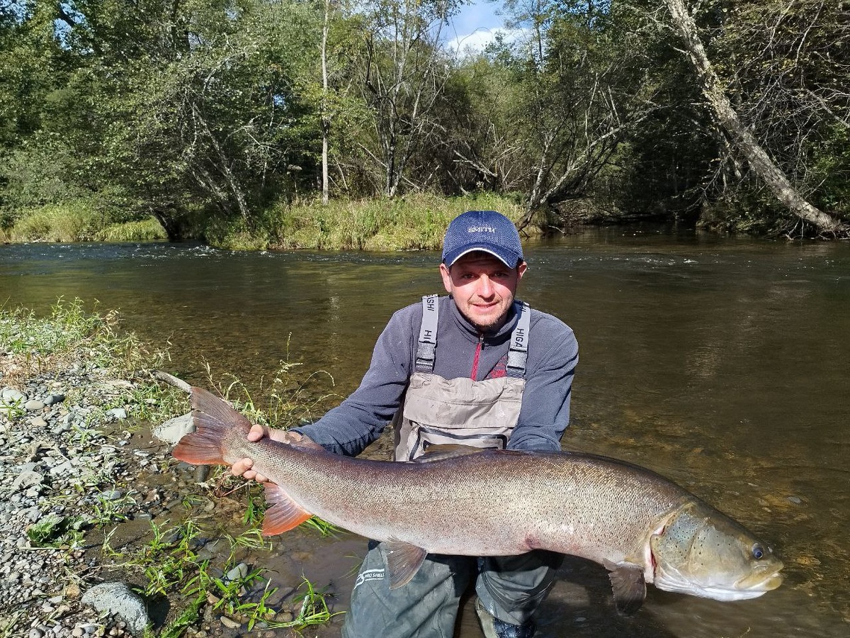 Здесь всё было по другому. Мощный тайменёвый комплект. Брал в лодку, пока шли сплавом. Вываживание заняло несколько минут.