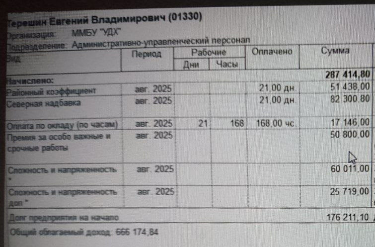 Мы изучили августовский расчётный листок Евгения Владимировича и пришли к выводу, что гражданин начальник работал сложно и напряжённо работал, за что получил надбавку в сумме 85+ тыс. рублей, а ещё был премирован деньгами в сумму 50,8 тыс. рублей «за особо важные и срочные работы». Простых математических действий хватает, чтобы посчитать итоговое начисление – 287,4 тыс руб. (за вычетом НДФЛ на руки получается около 250 тыс. рублей). Очевидно, на эту сумму зарплаты договаривались Лебедев с Терёшиным, когда принимал последнего на работу.