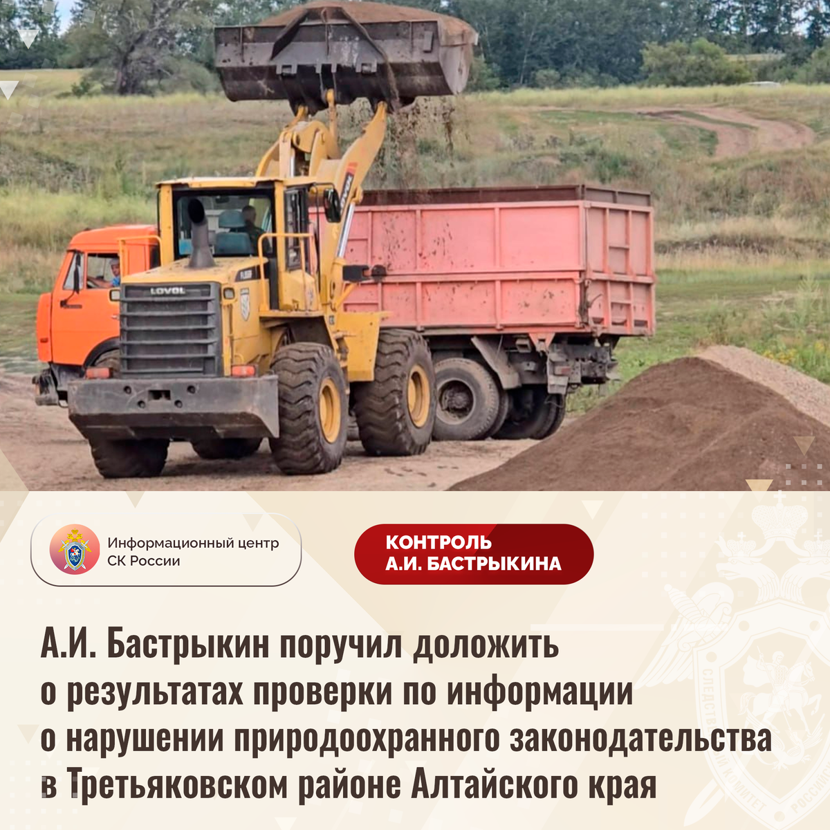 А.И. Бастрыкин поручил доложить о результатах проверки по информации о нарушении природоохранного законодательства в Третьяковском районе